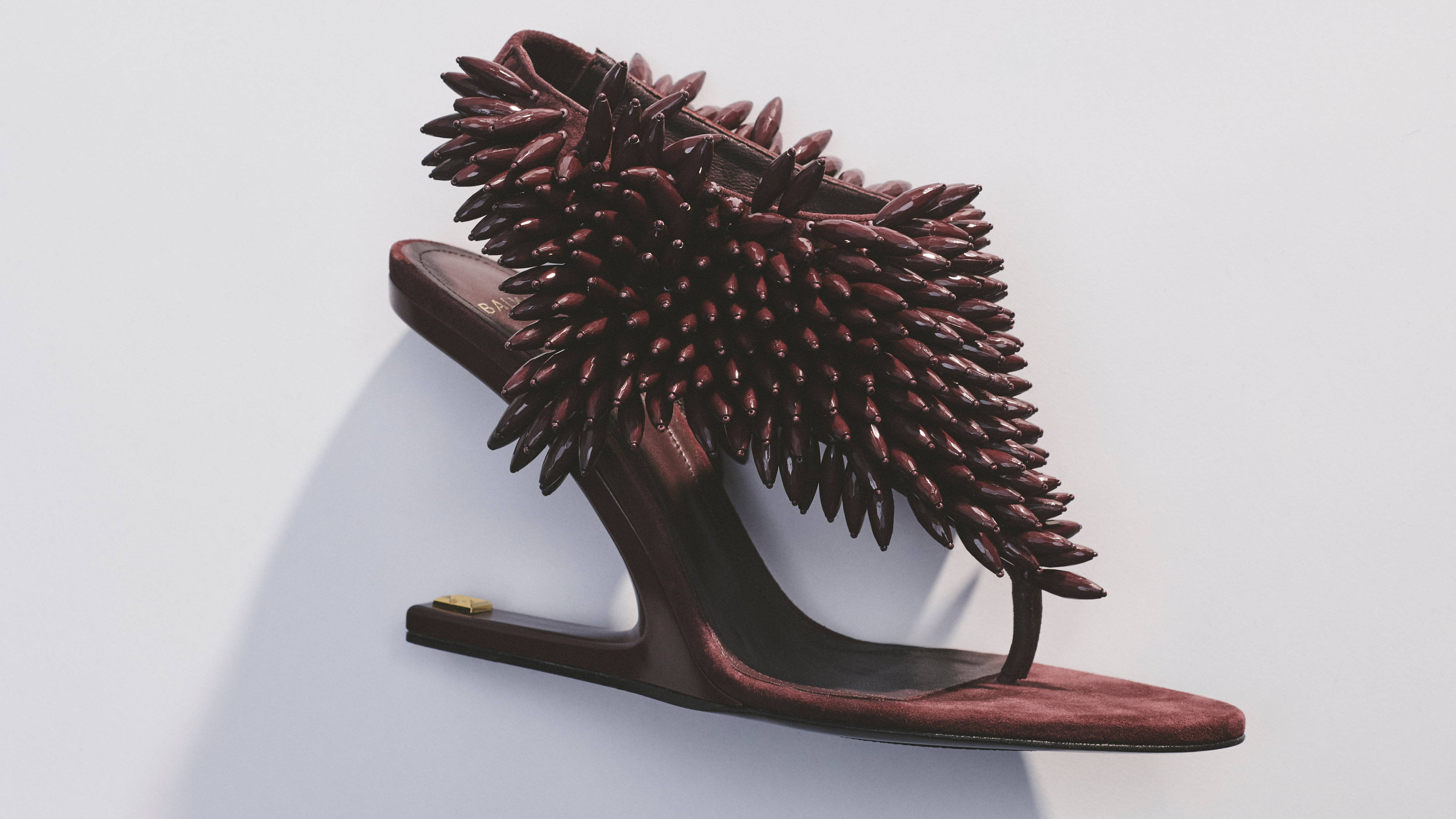 Shells reappear on heeled and flat sandals. The look of sand and sea ripples is echoed on dune-inspired pumps and winter boots, reworked with a new hollowed-out heel - just a thin, rigid bar that epitomizes the House's fusion of architectural precision and bold sophistication.